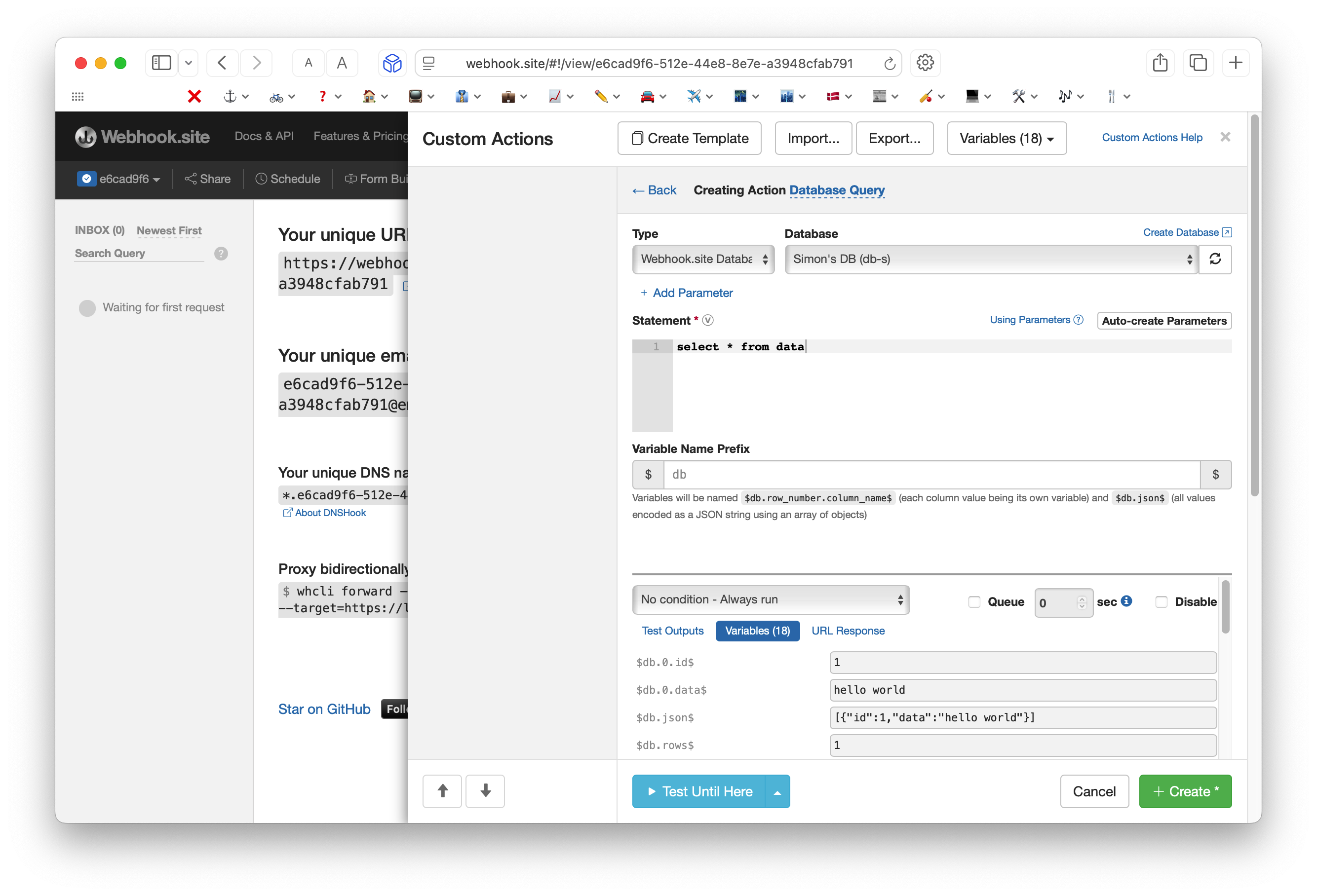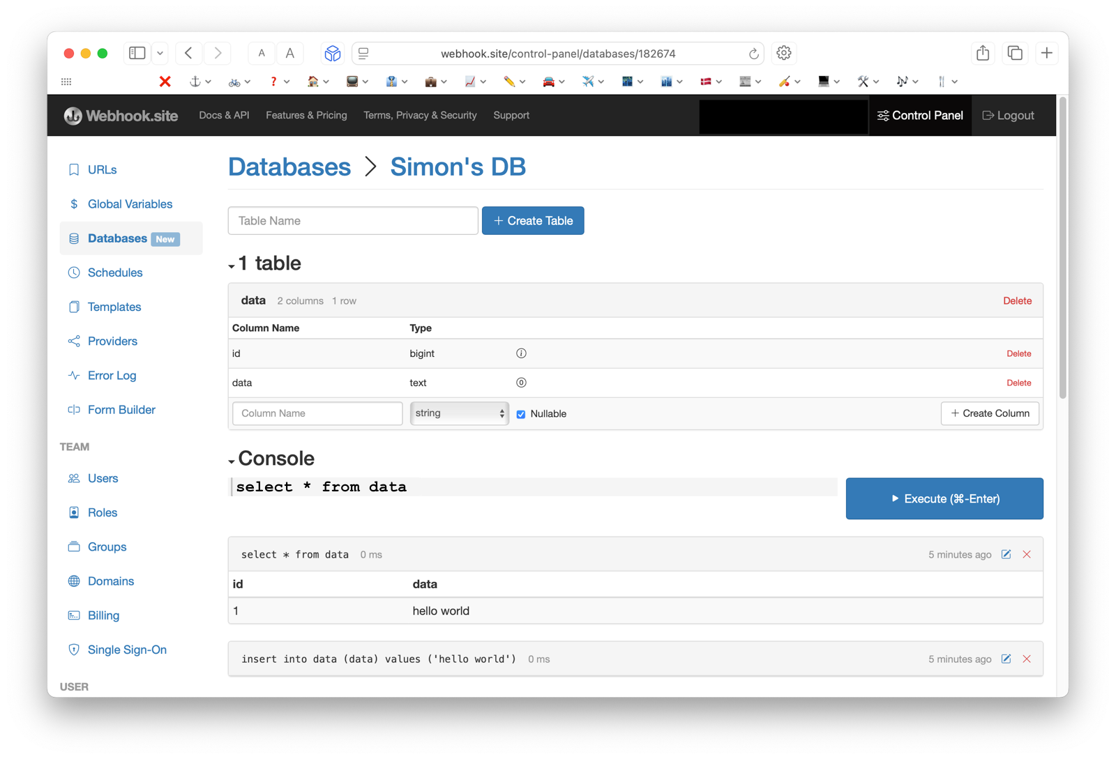 Additionally, with Webhook.site's simple API, you can manage your Database, including running SQL queries.